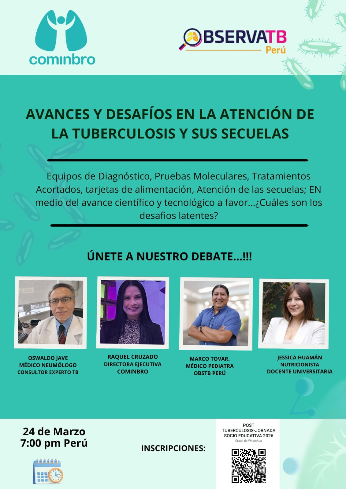Como parte del DíaMundialdelaTuberculosis, te invitamos a ser parte del debate: “Avances y desafíos en la atención de la tuberculosis y sus secuelas”, organizado por Observa TB Perú y Cominbro.